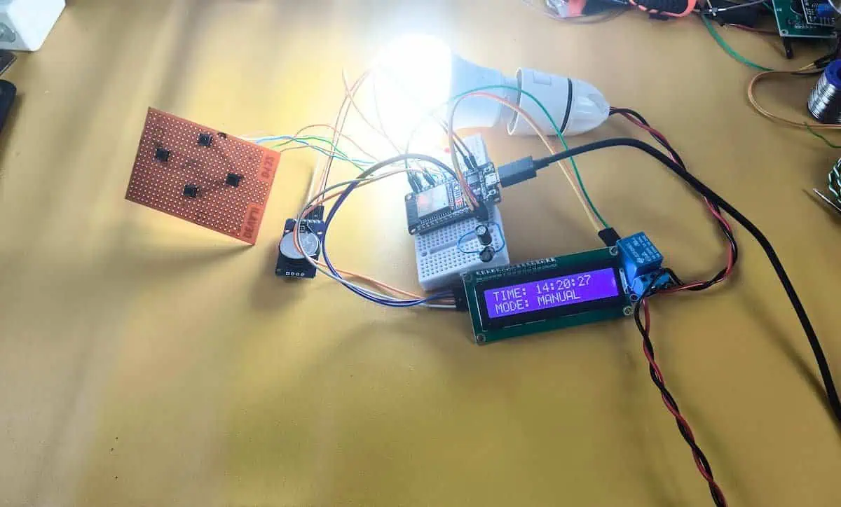 A functional automatic on off timer switch prototype built with ESP32, DS3231 RTC, and a relay, controlling an AC light bulb.